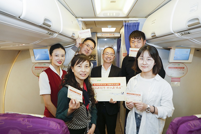 “只用當季新花生,低溫蒸炒,不勾兌,不調香,頭道初榨,地道原香。”美麗的工作人員正熱情的向乘客們講述著“如何分辨好的花生油”……