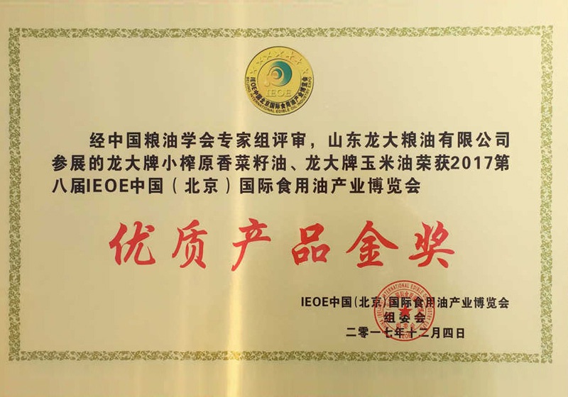 12月4日,第八屆IEOE中國國際食用油產業博覽會在北京盛大開幕。山東龍大糧油有限公司生產的龍大牌小榨原香菜籽油和龍大牌玉米油憑借過硬的品質獲得“優質產品金獎”殊榮。